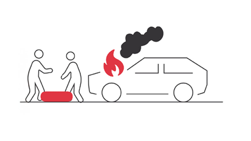 Ensure the fire blanket is sealed tightly against the ground on all sides. Do not attempt to remove it yourself—only trained firefighters should uncover the vehicle. When removing the blanket, it must always be pulled away from the car, never towards it.