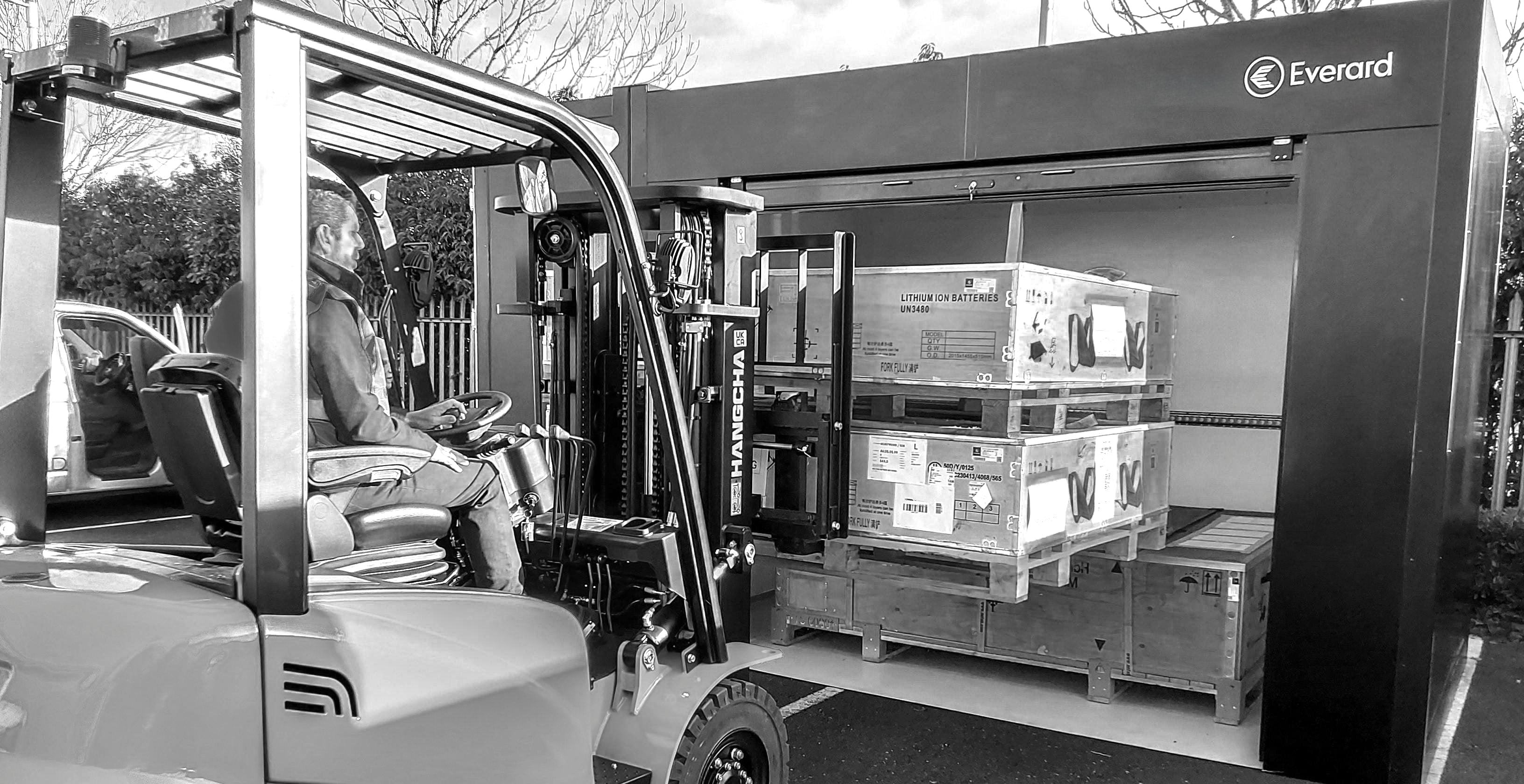 Everard's EV Battery storage box is a prefabricated building designed with external storage, boasting easy access for personnel and loading vehicle batteries.