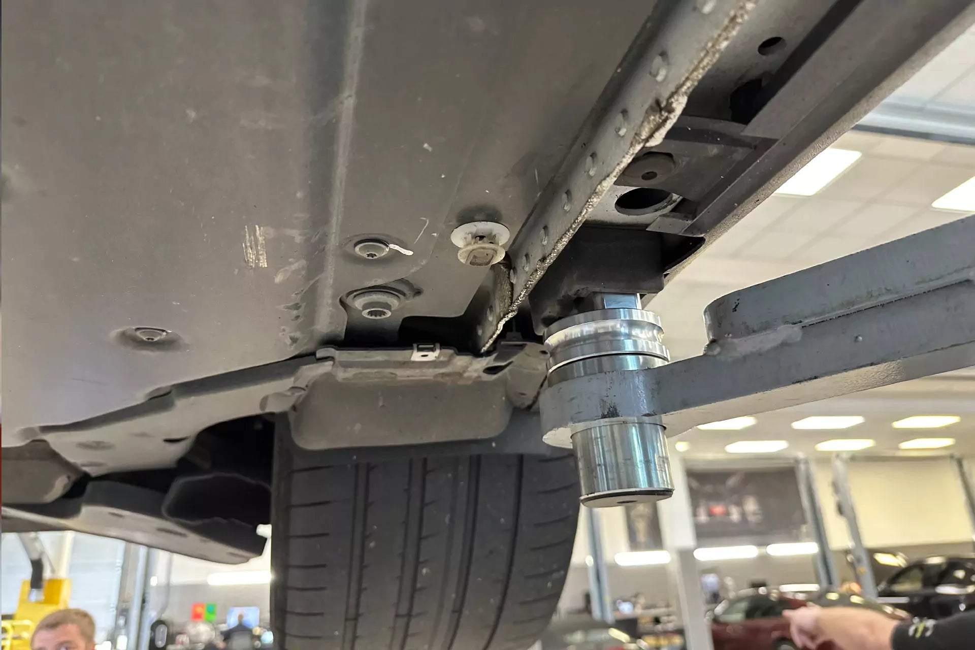 The pushAdapterEASY represents the ideal solution for battery removal and the extraction of underbody protection on cars. This innovative adapter can easily replace the existing pad adapter of a car lift. With three different bushing sizes, it fits almost all types of car lifts.